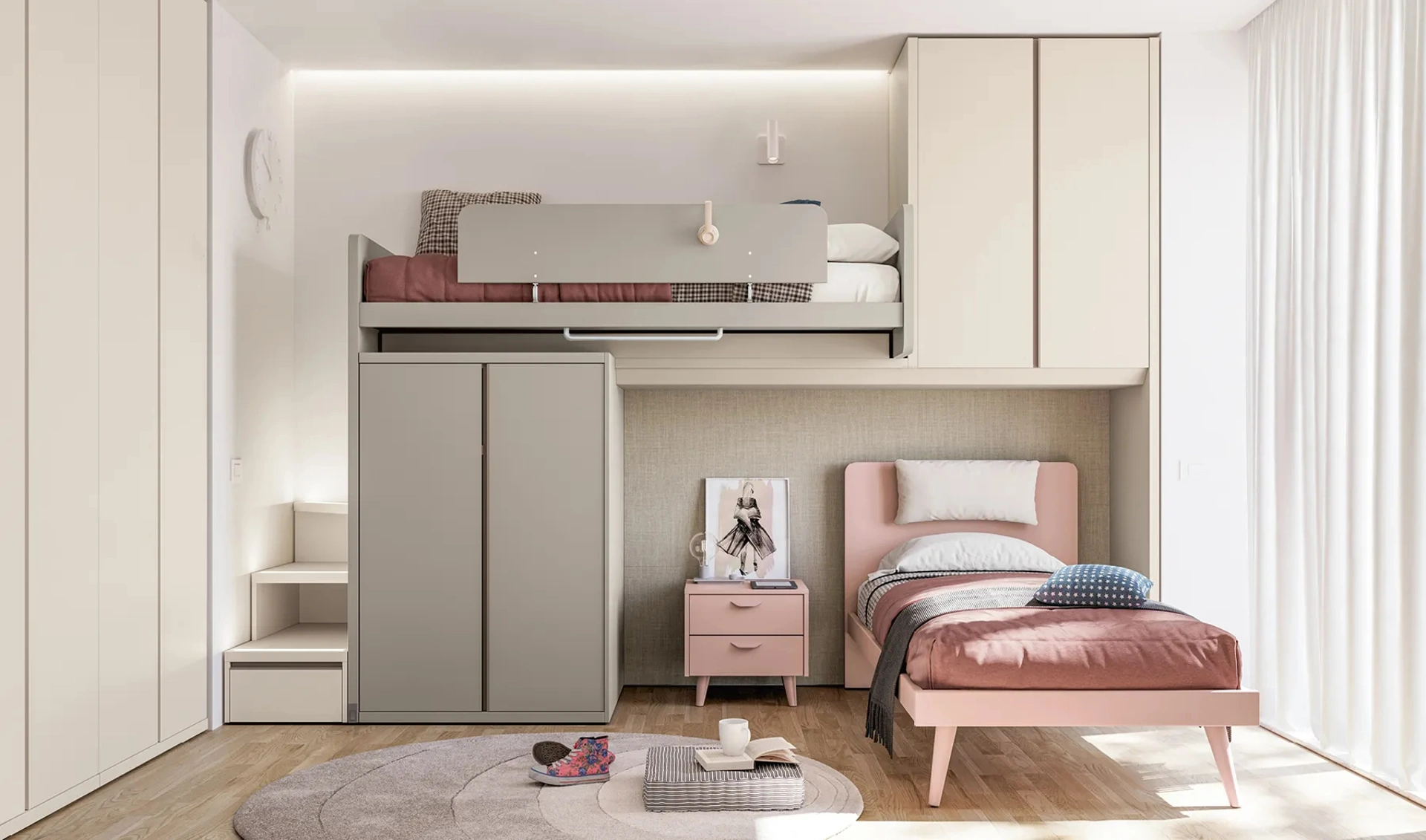 Doimo Cityline asseconda lo stile dei piccoli e le necessità dei genitori con le sue Camerette moderne a soppalco, ideali per necessità di ogni tipo. Vieni nel nostro showroom e potrai toccare con mano tutte le più esclusive composizioni d'arredo a soppalco moderne di Doimo Cityline per i più giovani. Con una composizione arredativa Doimo Cityline, potrai ultimare con funzionalità e design il luogo dove i tuoi figli trascorrono gli anni fondamentali della vita. Cromie di tendenza e progetti articolati eccellenti caratterizzano le più esclusive offerte del noto e conosciuto brand che proponiamo nel nostro showroom. La Cameretta Layout 15B di Doimo Cityline in laccato opaco è un universo complesso da progettare attentamente, coniugando molteplici accessori su misura.